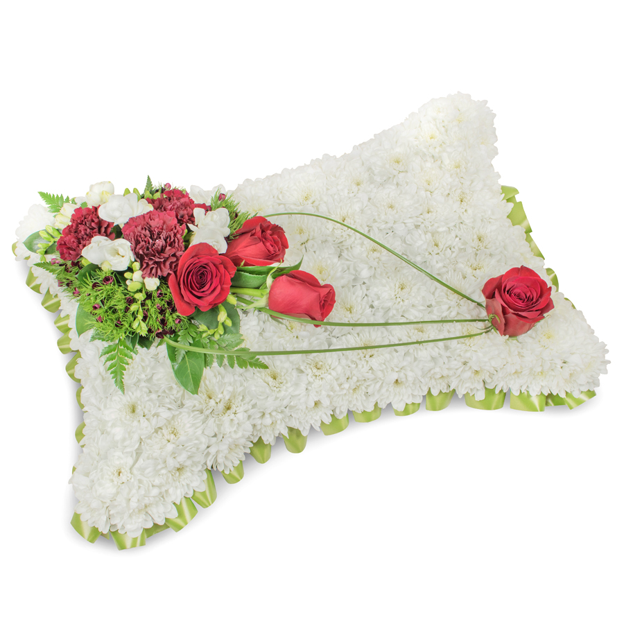 Offer a gesture of heartfelt sympathy with our premium floral arrangement, thoughtfully designed to convey warmth and respect. This exquisite bouquet features an artful mix of white chrysanthemums, red roses, white freesias, dark red carnations, dianthus, and bear grass. Each flower is carefully hand-selected to ensure optimum freshness and vibrant color, making it a luminous expression of compassion.